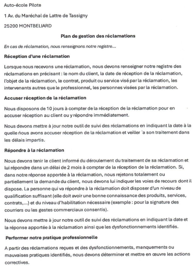 Modalités de traitement des réclamations